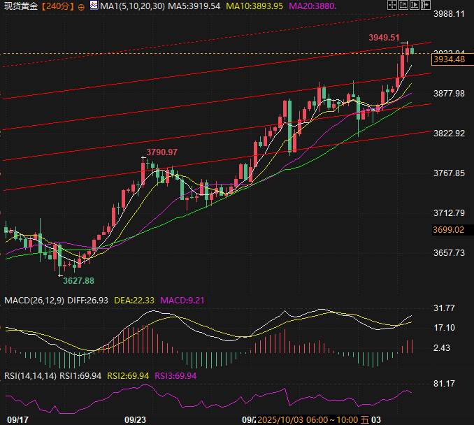 周一(10月6日),亚欧时段,现货黄金加速上行,一度涨至1.59%,目前小幅回落交投于3939.49美元/盎司,涨1.36%。黄金目前已实现连续七周上涨。此前,在杰罗姆·鲍威尔于杰克逊霍尔发表讲话前后,黄金完成牛旗形态突破;且即便当前通胀仍处高位,市场也普遍认为美联储不会放弃已纳入定价的降息计划——由此可见,推动金价上行的基本面逻辑目前尚无终结迹象。
