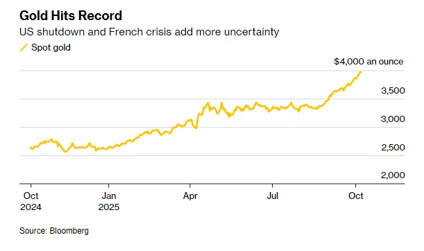 美国政府停摆刚刚传来大消息!金价又飙升接近4000美元 刷新纪录高位