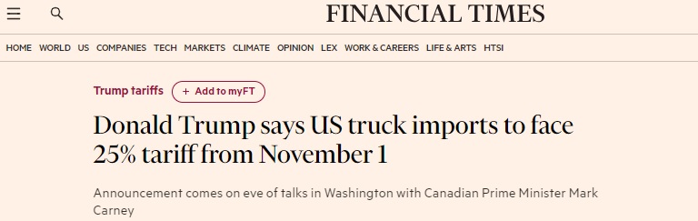 FX168财经报社(亚太)讯 英国《金融时报》周一(10月6日)报道称,美国总统特朗普(Donald Trump)警告称,从11月1日起,进口到美国的中型和重型卡车将面临25%的关税,这是其对全球汽车行业供应链进行改革的新举措。