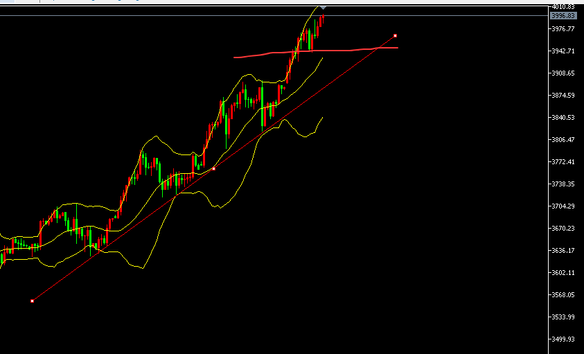 黄金再创新高4000.多头走得强势,如昨日日评预期一致,亚盘先修正,欧美盘就会创新高至4000关口,昨日日评以及盘中给出3945一线做多上看4000关口。基本如期到位,随着日线和周线的连续放量。接下来短线会伴随反复的探高回落走法,指标进入高位超买区域有待修正。短线连续放量之后通常伴随着迂回反复走法。