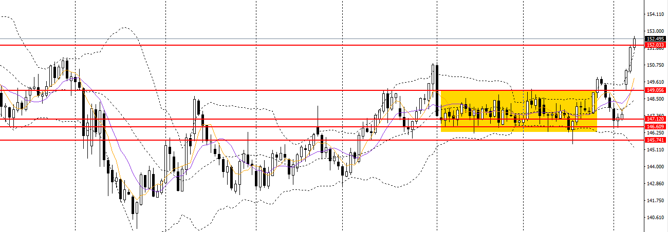 美日收超长阳柱,日线RSI到达高位,4小时连续拉升,走势极为强劲,多单仍可持有,短线可继续看多至153-153.20。