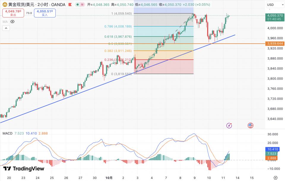 技术方面,经过早盘的大起大落后,黄金价格目前再次处于看涨趋势,4050的整数关口被频繁触及,2小时级别的均线系统走出多头排列,MACD金叉突破零轴且多头动能维持放量,一旦突破早上高点4060,价格将继续上涨至4080-4100区间。