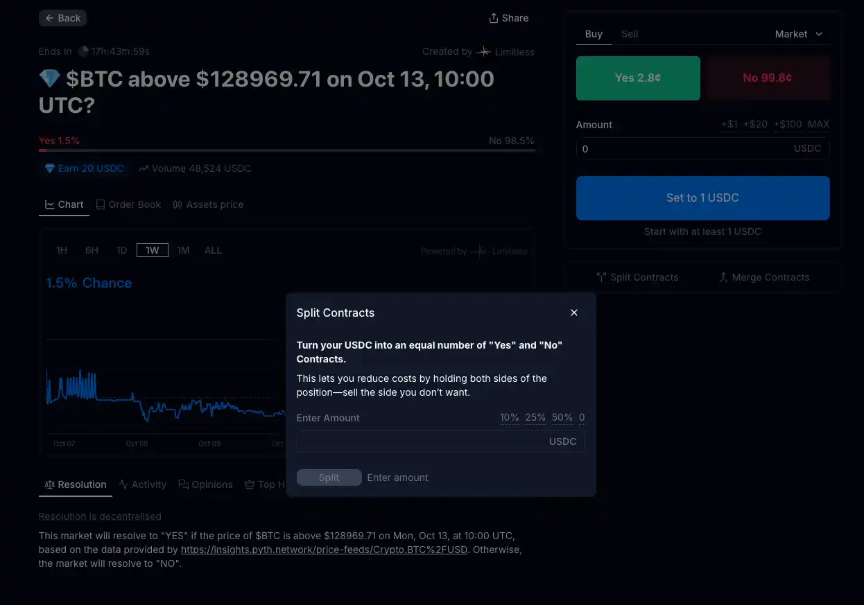 Limitless 是部署在 Base 区块链上的新兴预测市场平台,自 2024 年上线以来用户增长迅猛,迄今累计交易额已超过 4 亿美元,活跃用户数超过 3.7 万。其产品设计借鉴了中心化交易所的订单簿模型,支持拆分和合并 Yes/No 头寸以提高资金利用效率,并允许用户交易包含多个选项的事件市场。