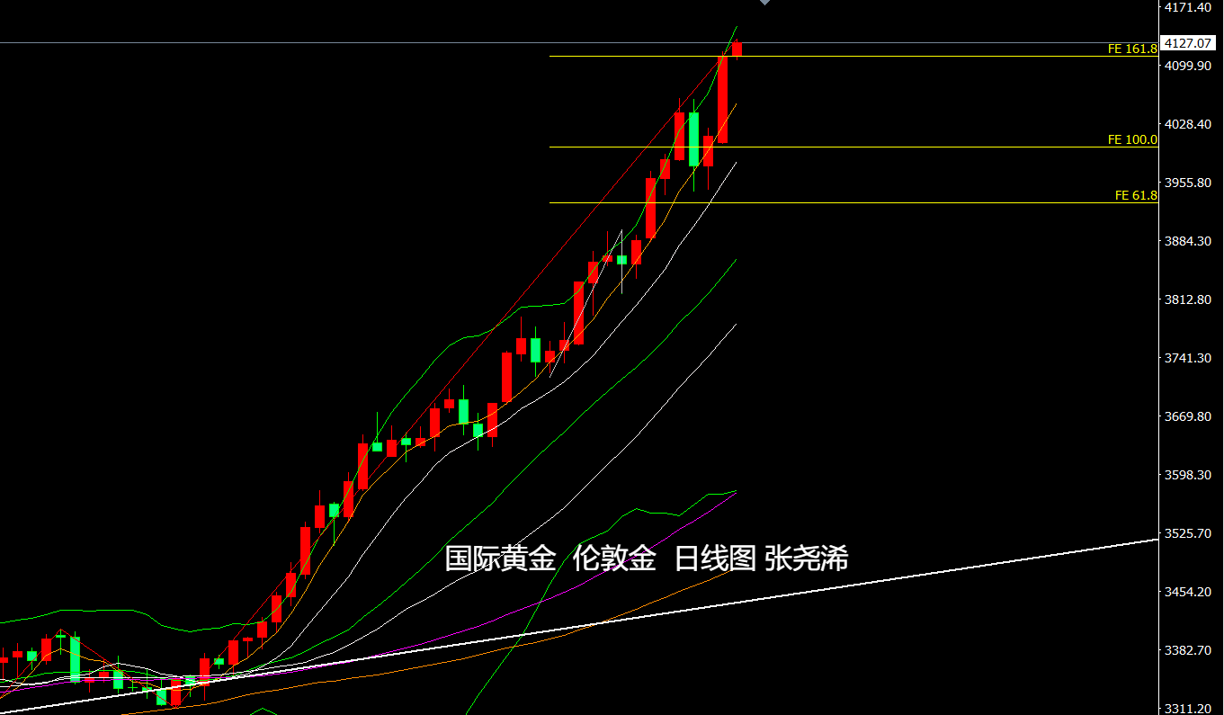 上交易日周一(10月13日):国际黄金强势拉升,再度刷新历史高点,如期触及给出的扩展线目标位4110美元,并持稳收阳,多头动力持稳,暗示后市将继续走强,等待触及7月份给出的看涨目标4200美元目标。