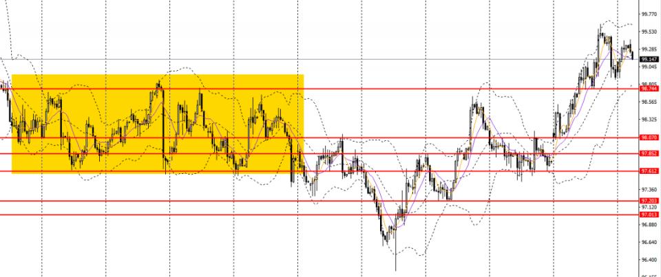 美元指数微幅反弹,围绕5日均线震荡,日线RSI位于50上方,4小时一度刺破99关口,但最终仍守住,短线大概率将延续震荡,可暂时观望。
