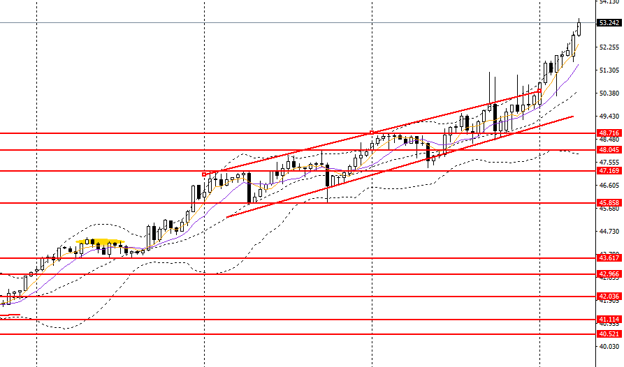 白银上破前高,刺破日线布林上轨,日线RSI位于超买区,52.70上方可延续低多思路,后市有望继续升破53。
