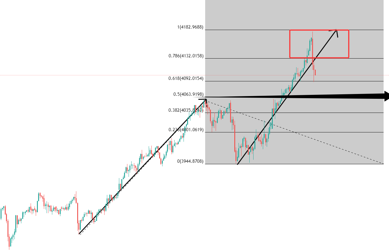 你看,我原本想的是,它连环上4100之后,FIBO拓展指标给的终点是4180,在这之前应该会走一波4100的摇摆和回踩,然后明天再选择涨到4180,去在这里押注一波回调下跌,谁知道这狗东西直接就上去了,还到位了,速度之快超出我想象,也就没敢真去下手做,我也怕再直接爆破4200啊!所以现在,要再做参与,只能寻求反弹交易机会,不可能直接跟跌的,还是我上面那句话,你黄金没延续之前,我不会认定你临时顶。