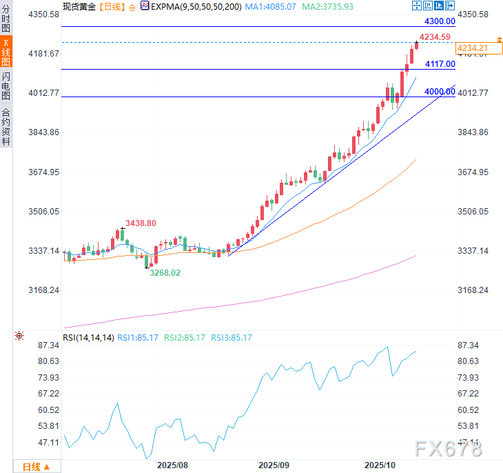 然而从相对强弱指数(RSI)等动量指标来看,金价已处于历史性超买状态,这类超买行情通常预示着价格将进入震荡整理或小幅修正阶段。