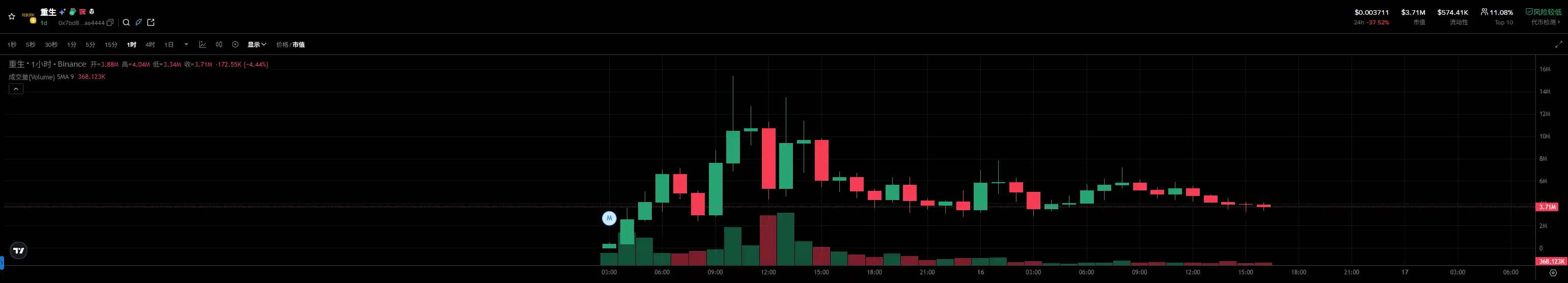 最先聚集起玩家们的共识并跑出来的「重生」币,是合约地址以「4444」为结尾的。从下面的 K 线图可以看到,从成功发射出来后,合约以「4444」为结尾的「重生」币就开始了上涨,最高市值一度突破 1500 万美元。