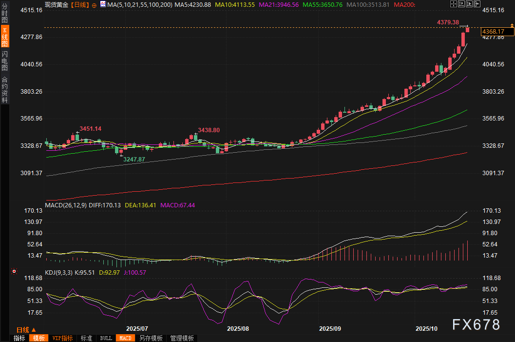 汇通财经APP讯——周五(10月17日)亚市早盘,现货黄金继续冲高,一度上涨1.24%,刷新历史高点至4379.38美元/盎司,较周四收盘价上涨逾50美元,本周迄今已经上涨近9%,周线大概率连续第九周上涨;周四金价大涨2.8%,为连续四个交易日收涨,收报4325.85美元/盎司,市场预计美联储10月将25个基点,12月甚至可能再降息50个点,SPDR黄金持仓大幅增加,汇丰银行也发布看涨报告,此外,美国政府继续停摆、国际贸易局势紧张也在持续吸引避险买盘支撑金价,各国央行购金以及去美元化趋势等多重因素也持续给金价提供上涨动能。