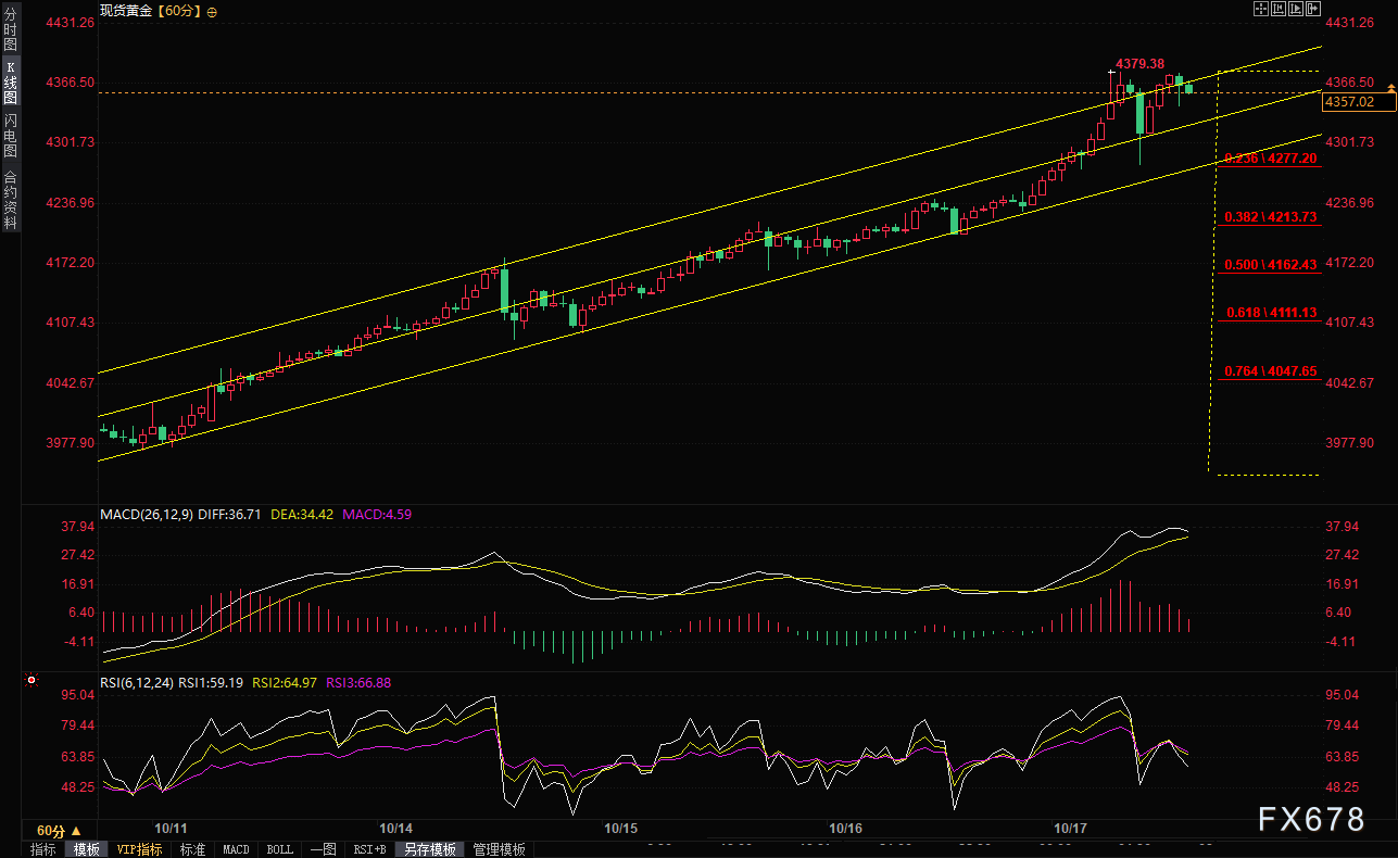 周五(10月17日)亚洲时段,现货黄金震荡走高,在刷新历史高点至4379.38美元/盎司后,一度急跌至4278.78美元/盎司,但很快受到逢低买盘支撑,一度回升至4378.48美元/盎司,目前交投于4360美元/盎司附近,本周迄今,涨幅达8.6%,有望连续第九周收涨。在持续的地缘政治不确定性、国际贸易紧张局势以及美国政府长时间关门的背景下,投资者对风险资产的兴趣减弱。这一点,连同对美联储(Fed)鸽派政策的预期,成为近期非收益黄金价格飙升的关键因素。