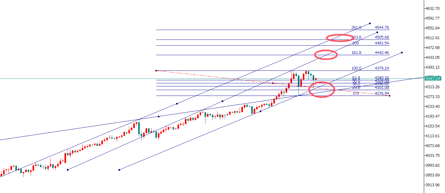 对于晚上的行情来说,直接看图,目前整体仍然处于上升势头,下方支撑看两个位置,4315和4290,倘若下破4290的话,那么小时图在这里就做M头,回落进而延伸到4214附近。上方重点关注4380,行情二次上探未破都展开崩盘,一旦再突破4380压制,那么上方进而有望继续冲击4442附近。