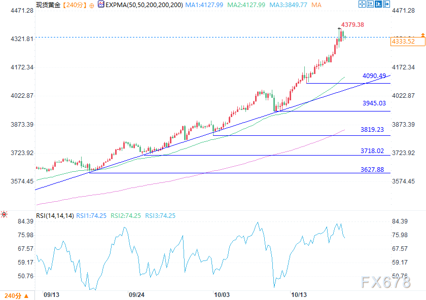 黄金日线图可以看出,因缺乏看空催化剂、看涨动能保持完好,黄金价格再度刷新历史高点。此次涨势的抛物线式特征极为显著,目前来看,日线图已基本失去分析参考价值,需缩小时间周期以获取更多细节信息。