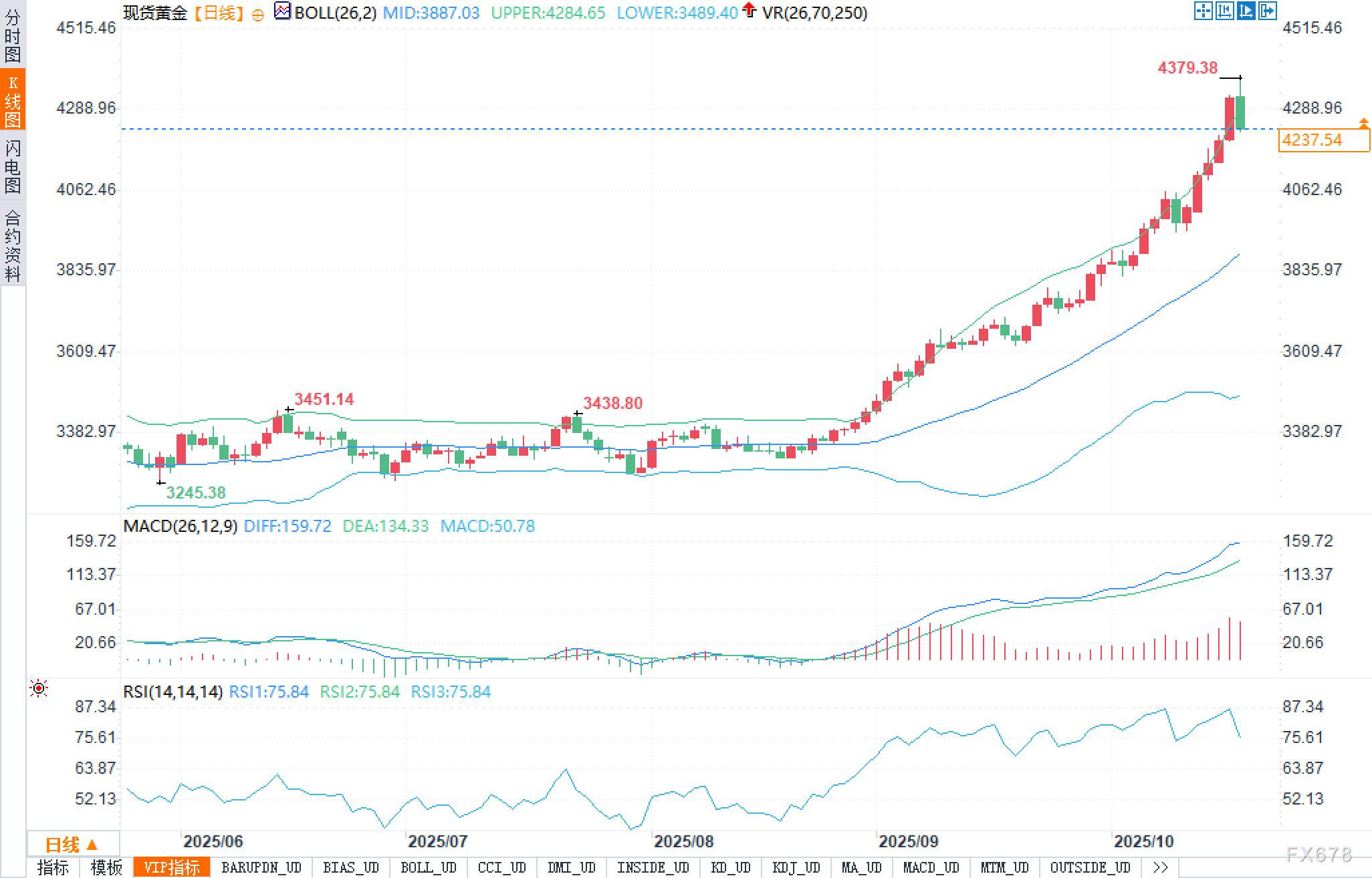 汇通财经APP讯——周五(10月17日),北美时段现货黄金于4250美元附近交投。此前金价一度上探4379.38美元的历史高位;当前回撤整理,但总体保持强势结构。