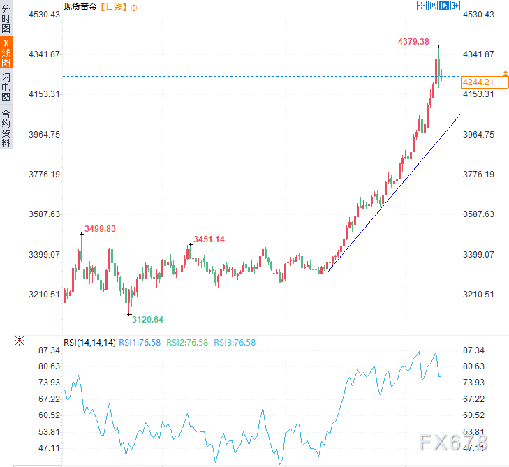 上周五现货黄金一度创下了4379.38美元/盎司的历史新高,却以1.8%的跌幅收盘于4247.17美元/盎司。