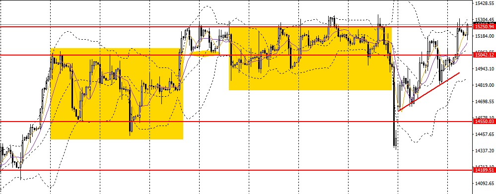 A50逼近日线前高,立于5日均线上方,4小时彻底站上15000关口,多单仍可持有,如有效上破15300,可进一步上看至15500。