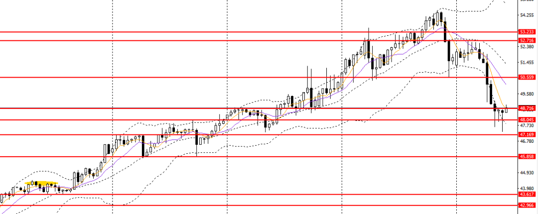 白银重幅下挫,失守日线布林中轨,日线RSI跌至50附近,4小时下破48.70,48两大关键支撑,空单仍可持有,如再度下破48,后市有望下探47-47.20。