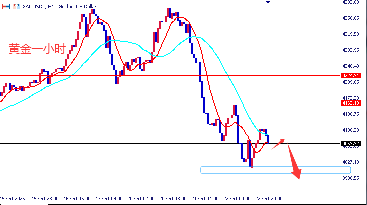 从之后的走势看,昨日周三亚盘开盘后,黄金经过短暂横盘,从4130美元开始,不到半小时急跌超过100美元,最低跌至4004美元,企稳后金价迅速反抽超过100美元,并在之后继续震荡回升,涨至4163美元遇阻,欧盘黄金震荡回落,跌至4015美元企稳,美盘开盘后,黄金反弹4085美元遇阻,回落4011美元企稳,临近收盘反弹4113美元遇阻。总体来看,黄金周三延续跌势,在我们给出的4000美元支撑附近企稳反弹,并到达压力位置4150美元,遇阻后金价回落继续企稳4000美元整数上方反弹,走势基本符合预期。