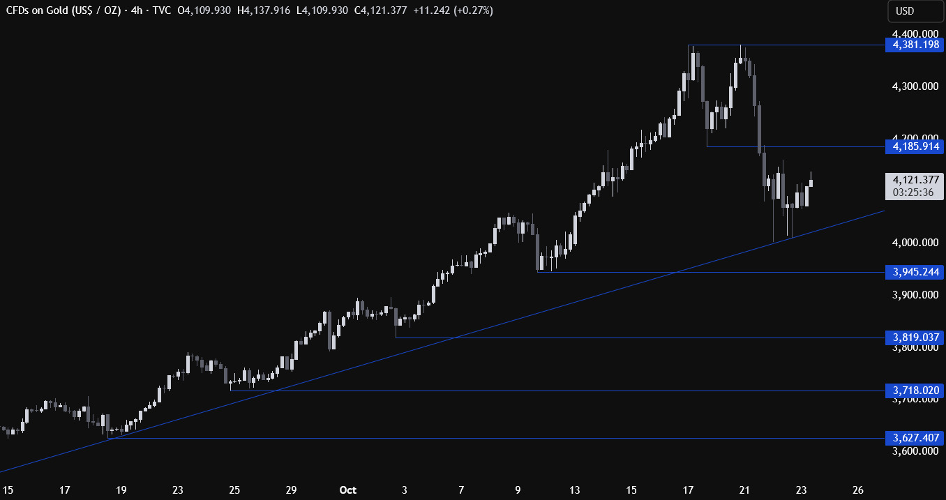 截至发稿,现货黄金上涨0.6%至4,119.49美元,此前一个交易日金价曾跌至近两周低点4004美元。