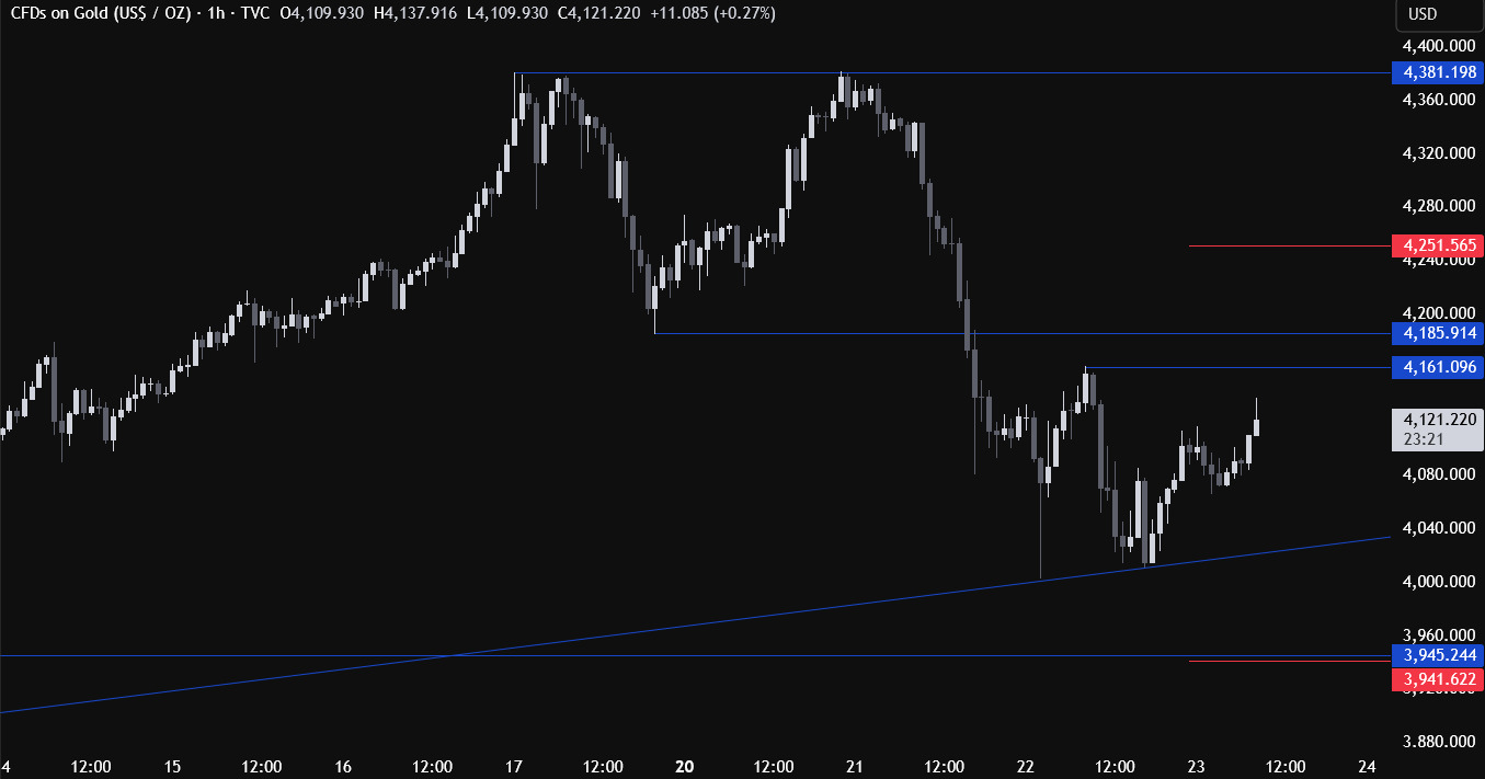 在1小时图上,金价可能继续在4000美元支撑与4185美元阻力之间震荡。若向任一方向突破,都可能引发新的持续趋势。红色线条表示当日平均波动区间。