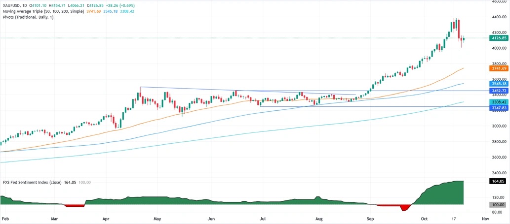 FXStreet分析师Christian Borjon Valencia指出,随着买家在美国CP之前进场,金价反弹至4100美元/盎司上方。特朗普制裁俄罗斯石油巨头卢克石油和俄罗斯国家石油公司,重新引发对避风港的地缘政治需求。据报道,白宫计划对中国实施新的软件出口限制,加剧科技紧张局势。