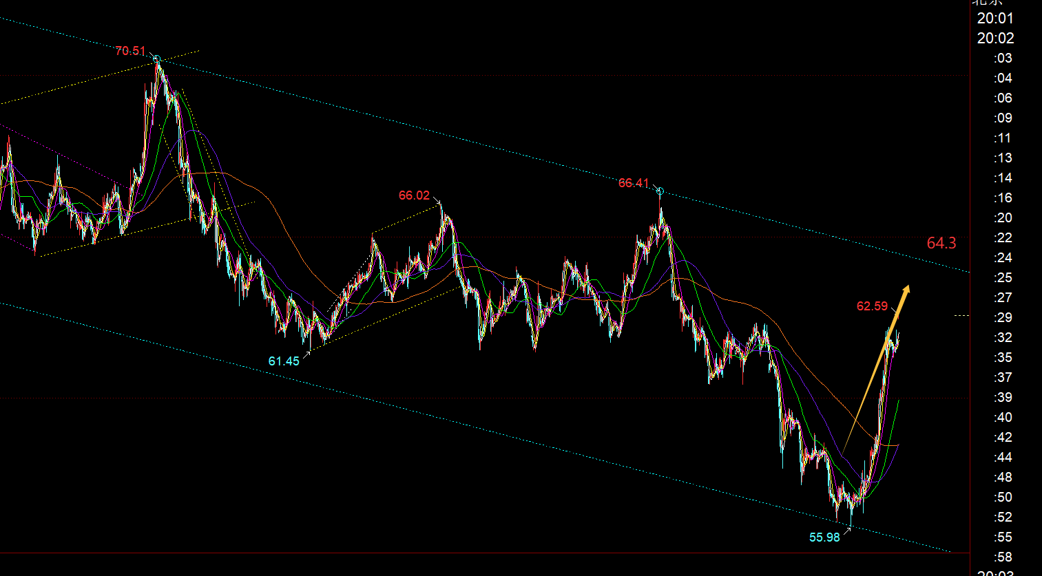 原油方面:继续拉升反弹向上,继续留意通道上轨64.3一线,这几日也算是小单边拉升;
