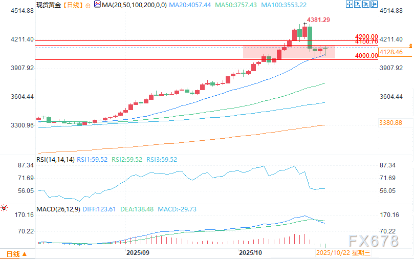 汇通财经APP讯——黄金本周经历了波动行情,周初先出现上涨,随后大幅下跌至4000美元支撑区间附近。成交量上升暗示可能正在形成顶部,而在近期抛物线式上涨后,回调至3800美元被视为健康的正常化走势。