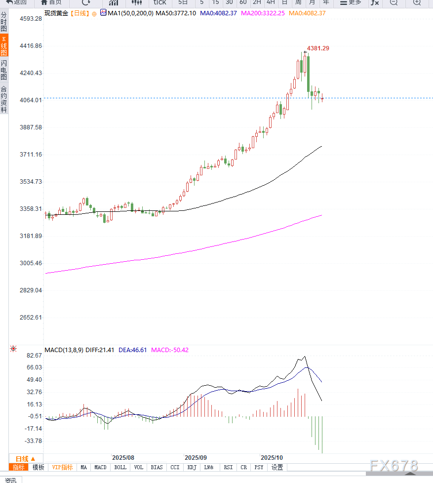 技术面显示,黄金已跌破7月至10月大幅上涨的23.6%斐波那契回撤位,但价格在4,044美元附近获得支撑,短线仍可能出现技术性反弹。