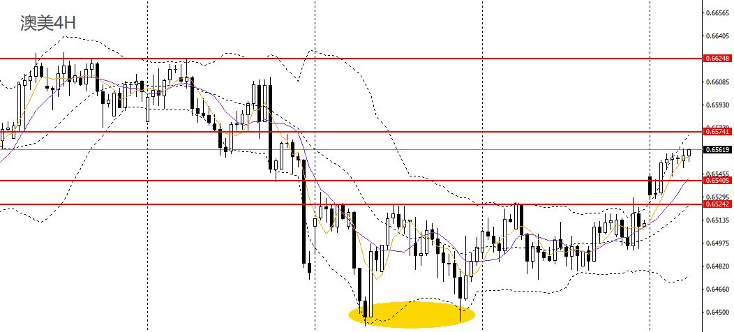 澳美收小阳线,今日延续涨势,未有回补昨日跳空缺口,日线RSI位于50附近,4小时站上关键压力0.6540,如回踩0.6540附近企稳可进多,后市有望继续上探0.6570,0.66-0.6620。