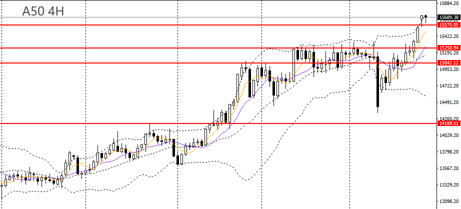 A50收锤子阳线,日线RSI到达高位,4小时多头动能放缓,短线多单可考虑减仓,如继续维稳于15500上方,后市仍有望上探16000。