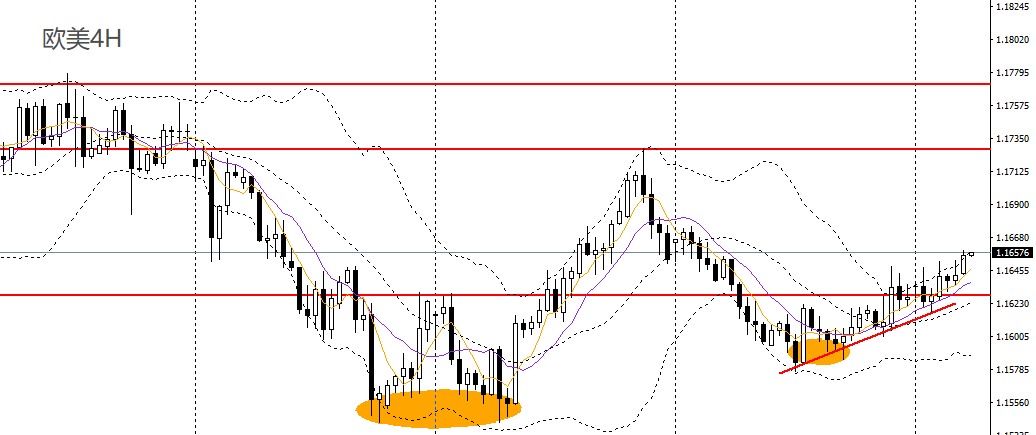 欧美昨日再收十字阳线,上破日线布林中轨,日线RSI位于50附近,4小时继续升破1.1650一线阻力,1.1650附近企稳可进多,后市有望上探1.1670,1.17。