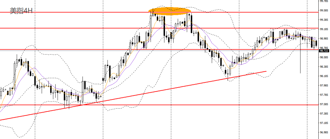 美元指数收小阴线,仍徘徊于5日、10日均线附近,4小时呈圆弧顶,刺破98.70附近支撑,如彻底下破,短线可看空至98-98.20。