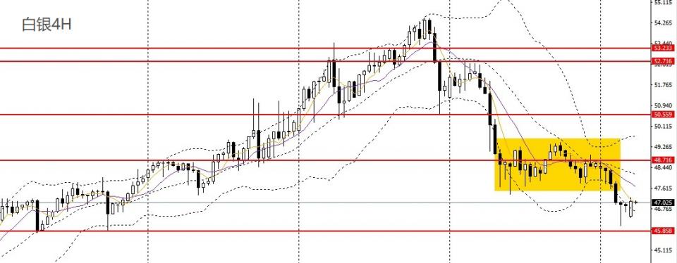 白银大幅下挫,承压于5日均线,日线RSI下破50,4小时失守47.70一线支撑,下行空间打开,47.40附近承压可继续进空,后市预计将进一步回踩45.80-46。