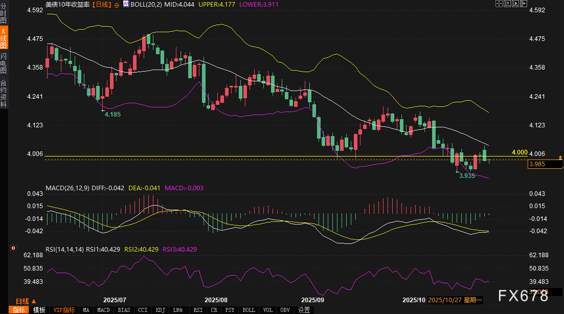 10年期美债收益率的技术图谱则更趋稳定,周一早盘一度突破4%(昨日收盘3.982%后短暂上探),但迅速回落至3.985%,日线级别形成小幅头肩顶形态,颈线位近3.97%。过去一周从4.02%的回落符合下降通道,RSI中性偏弱,布林带中轨提供支撑。若资金面排水持续(本周三日累计超500亿美元),收益率或测试3.95%低点,但4%关口作为心理锚定,易引发多空博弈。知名机构战术评估为“平仓偏好”,建议关注10年期在3.99%-3.96%区间的窄幅交易,FOMC结果或打破当前胶着。