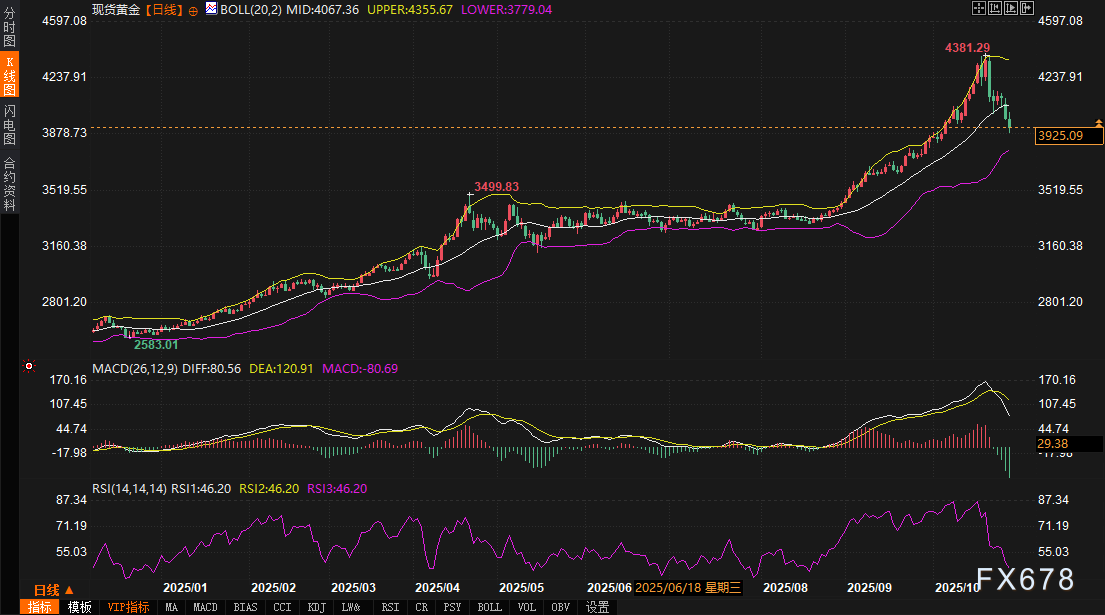 从技术层面,现货黄金日线图显示,自10月20日高点4381.29美元后的回调通道清晰,布林带呈收口趋势,暗示波动率收缩,可能酝酿方向性突破。MACD指标当前DIFF线位于80.46,DEA线为120.88,二者负背离加剧空头动能,但RSI回落至46.08,进入中性区且接近超卖阈值,结合日内从3886美元的低点反弹,短期内或在FOMC前企稳。美元指数的窄幅震荡(98-99.5区间)进一步印证,黄金走势独立性增强,非传统负相关主导。