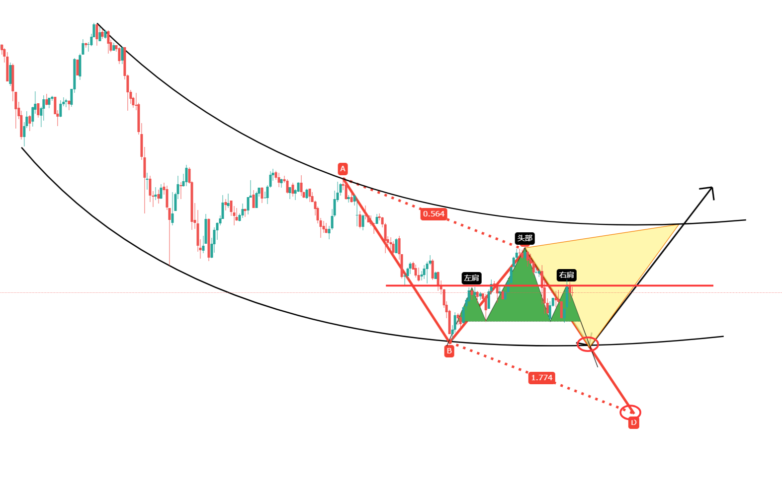 至于今天和后续嘛,我现在密切关注的还是前期低点3880,要说真正的一个调整目标位其实是3850,但是,不仅仅3880是前低我才关注的,你注意看整个黄金的下跌表现,是一个非常标准的曲线通道,它的顶和底,并不是那种常规趋势线的走法,而这个结构的特征也很明显,要么就在3880再度受到支撑,从而开始右侧反弹,只要反弹,那就有概率形成CRAB的形态或者W反转形态,这样黄金后续就可能会走周期性的上涨表现,这并不是我想交易的行情,所以就只能看第二种形态,那就是ABCD。