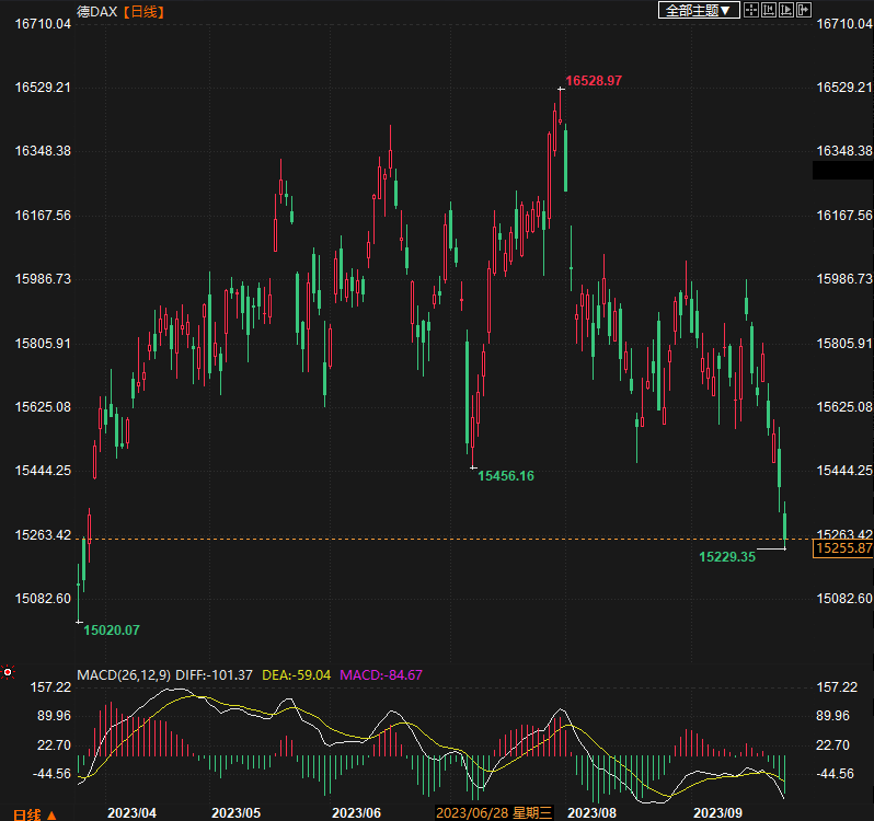 德国DAX30指数收盘下跌152.29点,跌幅0.99%,报15253.20点;