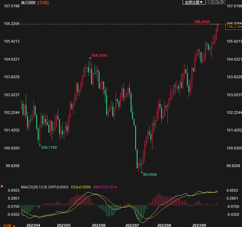 截至发稿, 美元指数上涨0.17%,至106.15,为2022年11月以来的最高水平。