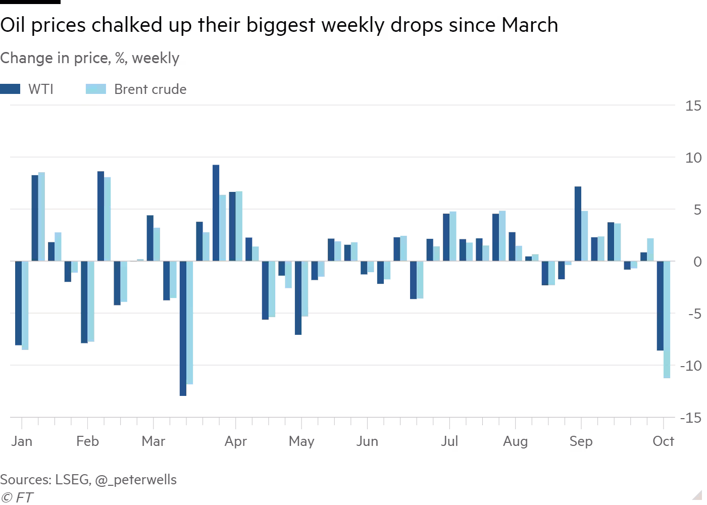 布伦特原油上周下跌 11.3%,WTI 下跌 8.6%,创 3 月份以来最大单周跌幅。