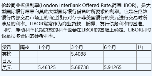 伦敦同业拆借利率(London InterBank Offered Rate,简写LIBOR),是大型国际银行愿意向其他大型国际银行借贷时所要求的利率。它是在伦敦银行内部交易市场上的商业银行对存于非美国银行的美元进行交易时所涉及的利率。LIBOR常常作为商业贷款、抵押、发行债务利率的基准。同时,浮动利率长期贷款的利率也会在LIBOR的基础上确定。LIBOR同时也是很多合同的参考利率。