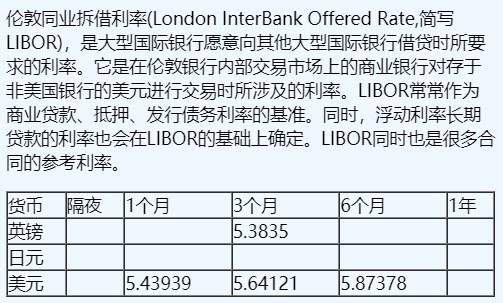 伦敦同业拆借利率(London InterBank Offered Rate,简写LIBOR),是大型国际银行愿意向其他大型国际银行借贷时所要求的利率。它是在伦敦银行内部交易市场上的商业银行对存于非美国银行的美元进行交易时所涉及的利率。LIBOR常常作为商业贷款、抵押、发行债务利率的基准。同时,浮动利率长期贷款的利率也会在LIBOR的基础上确定。LIBOR同时也是很多合同的参考利率。