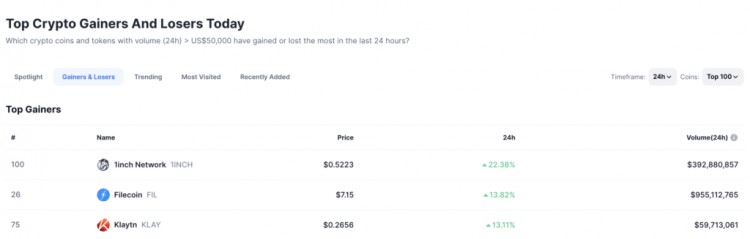 全球引用最多的加密货币价格跟踪网站 CoinMarketCap 报告称,1INCH、Filecoin 和 Klaytn 是涨幅最大的股票,在过去 24 小时内涨幅达到两位数。