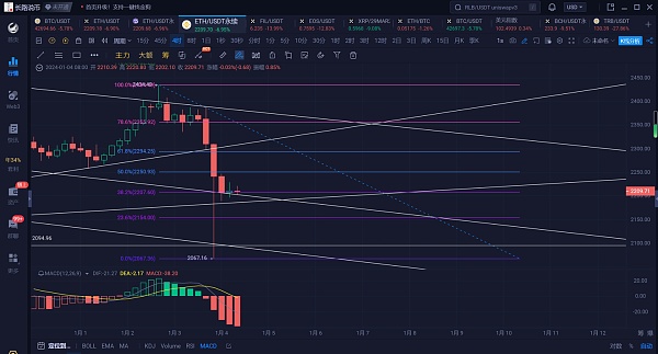 以太坊行情分析:之前长路就一直在视频和文章中提醒,周线方面有可能走出顶背离,大家一定要注意下跌风险,自上周行情走出2455高点后,本周行情再次反弹2435附近承压回落,从技术面可以看出,MACD绿色量柱继续缩量,其他技术指标也有向下的走势,而日线方面昨天走出长下影线大阴柱,从上轨直接插针下轨下方,再一次走出大跌行情,又需要花费大量的时间来修复下影线,而一波大跌后,行情会有一段震荡修复期,上方可关注中轨2265附近的压制,下方则关注下轨2150附近的支撑。