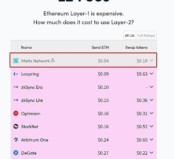 很多时候,我们会讨论 L2 存在的意义,更低的 Gas,更高的 TPS,更丝滑的用户体验,以拓展以太坊。但是很多 L2 的交互 Gas Fee 仍然居高不下,因为 Gas Fee 过高,很多需要高频交易的应用因为交互成本问题受到了限制。横向对比,Metis 的 Gas Fee 是所有 L2 中最低的,这为 Metis 的链上生态多样化带来了非常有利的基础条件!