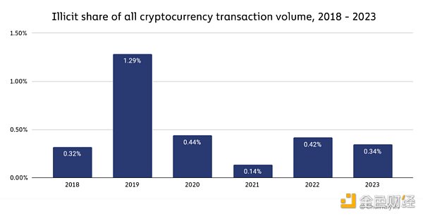 除了非法活动绝对值减少之外,我们对与非法活动相关的所有加密货币交易量份额的估计也从 2022 年的 0.42% 下降至 0.34%。 [1]