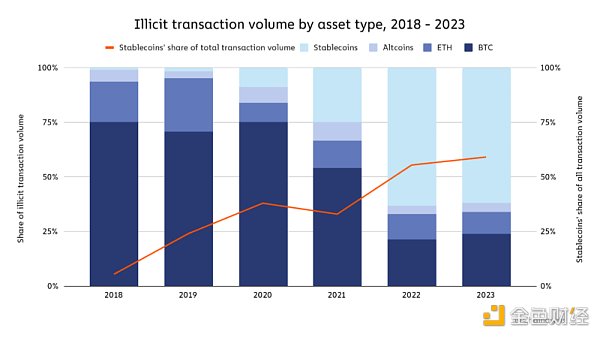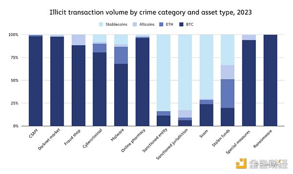 到 2021 年,比特币作为网络犯罪分子首选的加密货币占据了主导地位,这可能是由于其高流动性。 但这种情况在过去两年发生了变化,稳定币现在占所有非法交易量的大部分。 这一变化也伴随着最近稳定币在所有加密活动(包括合法活动)中所占份额的增长。 然而,稳定币的主导地位并不适用于所有形式的基于加密货币的犯罪。