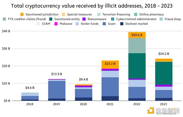 2023 年,非法加密货币地址收到的金额大幅下降,总计 242 亿美元。 与往常一样,我们必须警告说,这些数字是基于我们今天确定的非法地址的流入量的下限估计。 一年后,随着我们识别更多非法地址并将其历史活动纳入我们的估计,这些总数几乎肯定会更高。 例如,当我们去年发布加密犯罪报告时,我们估计 2022 年非法交易量价值 206 亿美元。一年后,我们对 2022 年的更新值为 396 亿美元。 这一增长很大程度上来自于对受制裁服务托管的先前未知的高度活跃地址的识别,以及我们将与受制裁司法管辖区的服务相关的交易量添加到我们的非法总量中。