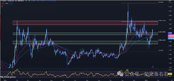 截至目前,DYDX 价格经历了今天的大幅下跌,下跌了4.96%,抵消了昨天8.11%的一部分涨幅。DYDX 现在正面临着对其前阻力区(2.905 美元至 3.002 美元)的关键重新测试,该价格区间是一个关键的支撑和阻力区域。DYDX 价格不稳定地徘徊在该区域之上,交易员对于是否触底或是否还会有更多下行空间存在疑虑。技术指标显示,DYDX 的 20 日均线目前位于 2.863 美元,而 50 日均线略高至 2.888 美元,这可能被视为初步看涨信号。