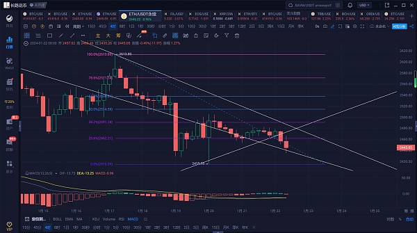 以太坊周末两天整体处于震荡运行中,多次反弹上方2485附近压制并未顺利突破,在今早刚刚下跌再次触及2430附近低点支撑。