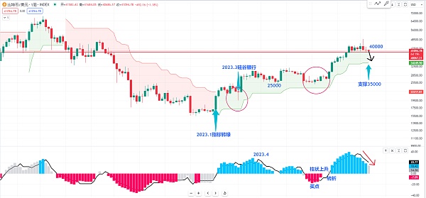 所以现在的比特币我们观察一下目前的qqe指标柱状还是在下降 短期我们尽量就观察40000这个位置能不能撑住 如果撑不住 我们尽量提防如果价格有来到支撑位35000附近 我建议到时候大家所有的空单都可以平仓 然后我们再找机会继续布局中长线的多单